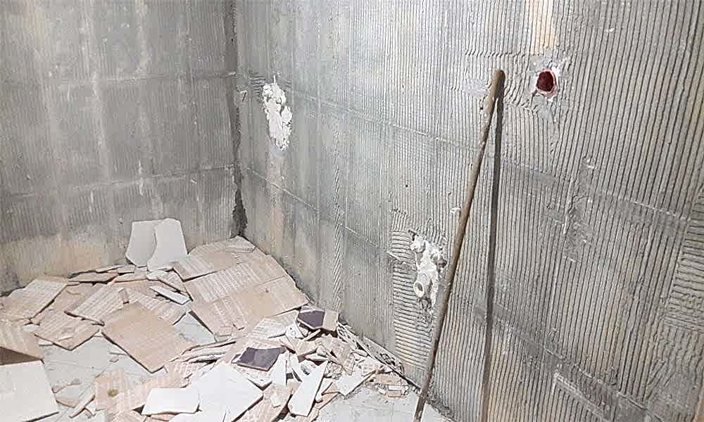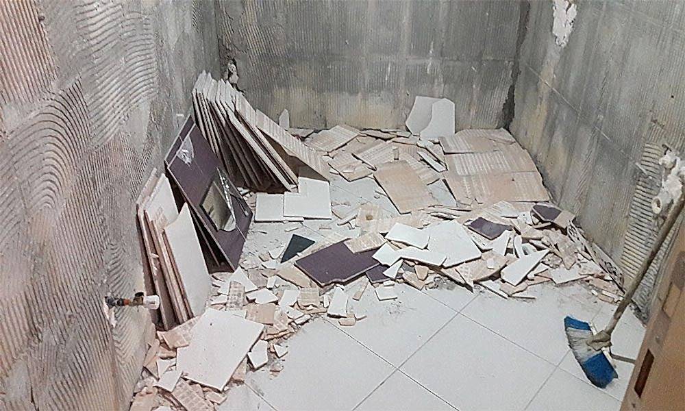 Öncelikle tüm duvarda ve zeminde bulunan eski tesisatları sökerek işimize başladık. Yenileriyle değiştireceğimiz tüm su tesisatı aksesuar, vana, çeşme, banyo dolabı, klozet, duş teknesi ve kabini gibi malzemeleri söktük. Sonrasında ise komple fayansları kırarak hafriyatları temizleyip attık.